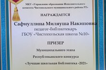 Поздравляем призера муниципального этапа Республиканского конкурса "Лучшая школьная библиотека -2021" педагога - библиотекаря Сафиуллину М. Н.