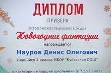 Науров Денис, 4 сыйныф укучысы. "Кышкы кич" рәсем "Яңа ел фантазияләре", призер дипломы.