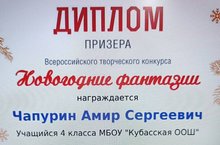 4 сыйныф укучысы, Чапурин Әмир. "Яңа ел фантазияләре" призер дипломы "Кыш Бабай"шигыре.