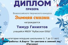 Гиниятов Тимур, 4 сыйныф укучысы, "Кышкы әкият"конкурсында призер Дипломы.