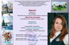 Дипломом ПОБЕДИТЕЛЯ I степени муниципального творческого конкурса "Фантазии мастеров", посвящённого году "Любви к Родному краю", за работу "Родные края" в номинации "Флористика" награждена наша ученица Лиза Яковлева. Поздравляем Лизоньку и её учителя Марину Леонидовну Гасишвили с ПОБЕДОЙ в конкурсе! Молодцы!