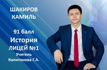 Историю сдавали 5 учащихся, из них 3 высокобалльника, набравших 80 баллов и выше, средний балл составил 73,4. Камиль Шакиров получил 91 балл, наивысший в Чистопольском муниципальном районе, Охотников Андрей – 89, Рахматуллина Рамина – 84. Учитель Капитонова Г. А.