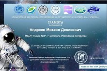 Поздравляем Мишу Андреева, ученика 5 Б класса, с ПОБЕДОЙ в КОСМИЧЕСКОЙ ВИКТОРИНЕ, посвящённой 60-летию полёта в космос Ю.А. Гагарина! Молодчина! Так держать!!!