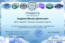 Новая победа Андреева Михаила, ученика 5 Б класса!!! ПОБЕДА во всероссийской викторине "На службе погоды", посвящённой всемирному метеорологическому дню!!! Здорово!!! Молодчина)