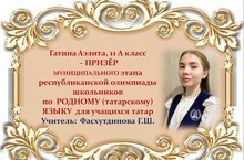 Поздравляем Аэлиту Гатину и её учителя Гульнару Шаукатовну Фасхутдинову с ПРИЗОВЫМ МЕСТОМ в муниципальном этапе Республиканской олимпиады школьников по РОДНОМУ (татарскому) ЯЗЫКУ среди учащихся 11 классов и желаем им новых ПОБЕД! Молодцы!!!