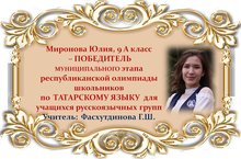 Поздравляем Юлию Миронову и её учителя Гульнару Шаукатовну Фасхутдинову с ПОБЕДОЙ в муниципальном этапе Республиканской олимпиады школьников по ТАТАРСКОМУ ЯЗЫКУ для учащихся русскоязычных групп среди учащихся 9 классов и желаем им новых ПОБЕД! Молодцы!!!