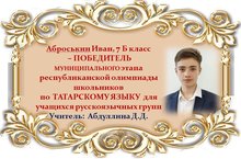 Поздравляем Ивана Аброськина и его учителя Данию Дамировну Абдуллину с ПОБЕДОЙ в муниципальном этапе Республиканской олимпиады школьников по ТАТАРСКОМУ ЯЗЫКУ для учащихся русскоязычных групп среди учащихся 7 классов и желаем им новых ПОБЕД! Молодцы!!!