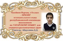 Поздравляем Нурлана Гусейнова и его учителя Данию Дамировну Абдуллину с ПРИЗОВЫМ МЕСТОМ в муниципальном этапе Республиканской олимпиады школьников по ТАТАРСКОМУ ЯЗЫКУ для учащихся русскоязычных групп среди учащихся 7 классов и желаем им новых ПОБЕД! Молодцы!!!