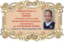 Поздравляем Камиллу Гафурову и её учителя Гульнару Шаукатовну Фасхутдинову с ПРИЗОВЫМ МЕСТОМ в муниципальном этапе Республиканской олимпиады школьников по РОДНОМУ (татарскому) ЯЗЫКУ среди учащихся 5 классов и желаем им новых ПОБЕД! Молодцы!!!