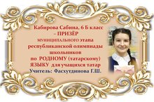 Поздравляем Сабину Кабирову и её учителя Гульнару Шаукатовну Фасхутдинову с ПРИЗОВЫМ МЕСТОМ в муниципальном этапе Республиканской олимпиады школьников по РОДНОМУ (татарскому) ЯЗЫКУ среди учащихся 6 классов и желаем им новых ПОБЕД! Молодцы!!!