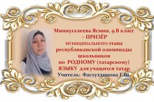 Поздравляем Ясмин Миннугалееву и её учителя Гульнару Шаукатовну Фасхутдинову с ПРИЗОВЫМ МЕСТОМ в муниципальном этапе Республиканской олимпиады школьников по РОДНОМУ (татарскому) ЯЗЫКУ среди учащихся 9 классов и желаем им новых ПОБЕД! Молодцы!!!