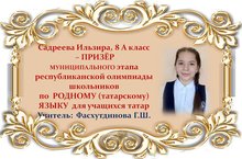 Поздравляем Ильзиру Садрееву и её учителя Гульнару Шаукатовну Фасхутдинову с ПРИЗОВЫМ МЕСТОМ в муниципальном этапе Республиканской олимпиады школьников по РОДНОМУ (татарскому) ЯЗЫКУ среди учащихся 8 классов и желаем им новых ПОБЕД! Молодцы!!!