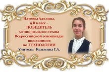 Поздравляем Аделину Натееву и её учителя Галину Александровну Кузьмину с ПОБЕДОЙ в муниципальном этапе Всероссийской олимпиады школьников по ТЕХНОЛОГИИ среди учащихся 9 классов и желаем им новых ПОБЕД! Молодцы!!!