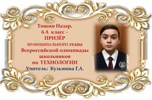 Поздравляем Назара Тишина и его учителя Галину Александровну Кузьмину с ПРИЗОВЫМ МЕСТОМ в муниципальном этапе Всероссийской олимпиады школьников по ТЕХНОЛОГИИ среди учащихся 6 классов и желаем им новых ПОБЕД! Молодцы!!!