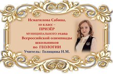 Поздравляем Сабину Исмагилову и её учителя Наталью Михайловну Голицину с ПРИЗОВЫМ МЕСТОМ в муниципальном этапе Всероссийской олимпиады школьников по ГЕОЛОГИИ среди учащихся 10 классов и желаем им новых ПОБЕД! Молодцы!!!