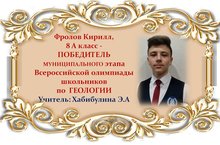Поздравляем Кирилла Фролова и его учителя Эльвиру Асгатовну Хабибулину с ПОБЕДОЙ в муниципальном этапе Всероссийской олимпиады школьников по ГЕОЛОГИИ среди учащихся 8 классов и желаем им новых ПОБЕД! Молодцы!!!