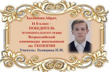 Поздравляем Айрата Хасаншина и его учителя Наталью Михайловну Голицину с ПОБЕДОЙ в муниципальном этапе Всероссийской олимпиады школьников по ГЕОЛОГИИ среди учащихся 11 классов и желаем им новых ПОБЕД! Молодцы!!!