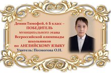 Поздравляем Тимофея Денина и его учителя Ольгу Николаевну Позмогову с ПОБЕДОЙ в муниципальном этапе Всероссийской олимпиады школьников по АНГЛИЙСКОМУ ЯЗЫКУ среди учащихся 6 классов и желаем им новых ПОБЕД! Молодцы!!!