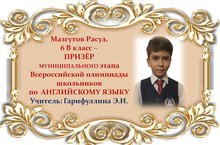 Поздравляем Расула Мазгутова и его учителя Эльвиру Ильдусовну Гарифуллину с ПРИЗОВЫМ МЕСТОМ в муниципальном этапе Всероссийской олимпиады школьников по АНГЛИЙСКОМУ ЯЗЫКУ среди учащихся 6 классов и желаем им новых ПОБЕД! Молодцы!!!