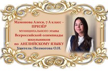 Поздравляем Алесю Мамонову и её учителя Ольгу Николаевну Позмогову с ПРИЗОВЫМ МЕСТОМ в муниципальном этапе Всероссийской олимпиады школьников по АНГЛИЙСКОМУ ЯЗЫКУ среди учащихся 7 классов и желаем им новых ПОБЕД! Молодцы!!!