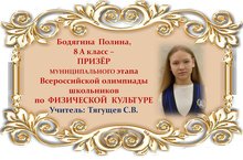 Поздравляем Полину Бодягину и её учителя Сергея Владимировича Тягущева с ПРИЗОВЫМ МЕСТОМ в муниципальном этапе Всероссийской олимпиады школьников по ФИЗИЧЕСКОЙ КУЛЬТУРЕ среди учащихся 8 классов и желаем им новых ПОБЕД! Молодцы!!!