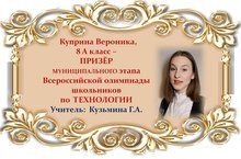 Поздравляем Веронику Куприну и её учителя Галину Александровну Кузьмину с ПРИЗОВЫМ МЕСТОМ в муниципальном этапе Всероссийской олимпиады школьников по ТЕХНОЛОГИИ среди учащихся 8 классов и желаем им новых ПОБЕД! Молодцы!!!