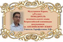 Поздравляем Карима Мухутдинова и его учителя Эльвиру Ильдусовну Гарифуллину с ПОБЕДОЙ в муниципальном этапе Всероссийской олимпиады школьников по АНГЛИЙСКОМУ ЯЗЫКУ среди учащихся 9 классов и желаем им новых ПОБЕД! Молодцы!!!