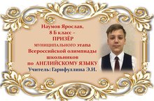 Поздравляем Ярослава Наумова и его учителя Эльвиру Ильдусовну Гарифуллину с ПРИЗОВЫМ МЕСТОМ в муниципальном этапе Всероссийской олимпиады школьников по АНГЛИЙСКОМУ ЯЗЫКУ среди учащихся 8 классов и желаем им новых ПОБЕД! Молодцы!!!
