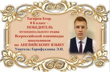 Поздравляем Егора Тагирова и его учителя Эльвиру Ильдусовну Гарифуллину с ПОБЕДОЙ в муниципальном этапе Всероссийской олимпиады школьников по АНГЛИЙСКОМУ ЯЗЫКУ среди учащихся 8 классов и желаем им новых ПОБЕД! Молодцы!!!