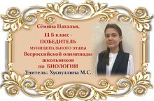 Поздравляем Наталью Сёмину и её учителя Марину Сергеевну Хуснуллину с ПОБЕДОЙ в муниципальном этапе Всероссийской олимпиады школьников по БИОЛОГИИ среди учащихся 11 классов и желаем им новых ПОБЕД! Молодцы!!!