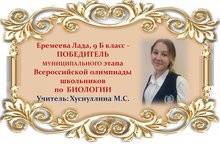 Поздравляем Ладу Еремееву и её учителя Марину Сергеевну Хуснуллину с ПОБЕДОЙ в муниципальном этапе Всероссийской олимпиады школьников по БИОЛОГИИ среди учащихся 9 классов и желаем им новых ПОБЕД! Молодцы!!!