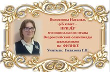 Поздравляем Наталью Волостнову и её учителя Гульназ Ниязовну Гилязову с ПРИЗОВЫМ МЕСТОМ в муниципальном этапе Всероссийской олимпиады школьников по ФИЗИКЕ среди учащихся 9 классов и желаем им новых ПОБЕД! Молодцы!!!
