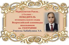 Поздравляем Раиля Нуриахметова и его учителя Эльвиру Асгатовну Хабибулину с ПОБЕДОЙ в муниципальном этапе Всероссийской олимпиады школьников по ГЕОГРАФИИ среди учащихся 7 классов и желаем им новых ПОБЕД! Молодцы!!!