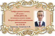 Поздравляем Азамата и его учителя Айрата Фазылзяновича Ахметова с ПОБЕДОЙ в муниципальном этапе Всероссийской олимпиады школьников по ОБЖ среди учащихся 5 классов и желаем им новых ПОБЕД! Молодцы!!!