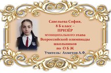 Поздравляем Софию Савельеву и её учителя Айрата Фазылзяновича Ахметова с ПРИЗОВЫМ МЕСТОМ в муниципальном этапе Всероссийской олимпиады школьников по ОБЖ среди учащихся 8 классов и желаем им новых ПОБЕД! Молодцы!!!