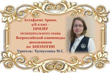 Поздравляем Арину Астафьеву и её учителя Марину Сергеевну Хуснуллину с ПРИЗОВЫМ МЕСТОМ в муниципальном этапе Всероссийской олимпиады школьников по БИОЛОГИИ среди учащихся 9 классов и желаем им новых ПОБЕД! Молодцы!!!