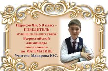 Поздравляем Яна Идрисова и его учителя Юлию Сергеевну Макарову с ПОБЕДОЙ в муниципальном этапе Всероссийской олимпиады школьников по МАТЕМАТИКЕ среди учащихся 6 классов и желаем им новых ПОБЕД! Молодцы!!!