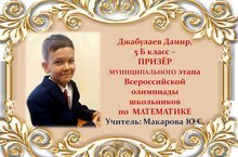 Поздравляем Дамира Джабулаева и его учителя Юлию Сергеевну Макарову с ПРИЗОВЫМ МЕСТОМ в муниципальном этапе Всероссийской олимпиады школьников по МАТЕМАТИКЕ среди учащихся 5 классов и желаем им новых ПОБЕД! Молодцы!!!