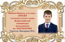 Поздравляем Никиту Михеева и его учителя Юлию Сергеевну Макарову с ПРИЗОВЫМ МЕСТОМ в муниципальном этапе Всероссийской олимпиады школьников по МАТЕМАТИКЕ среди учащихся 5 классов и желаем им новых ПОБЕД! Молодцы!!!