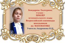 Поздравляем Екатерину Бондареву и её учителя Наталью Николаевну Андронову с ПРИЗОВЫМ МЕСТОМ в муниципальном этапе Всероссийской олимпиады школьников по МАТЕМАТИКЕ среди учащихся 7 классов и желаем им новых ПОБЕД! Молодцы!!!