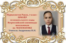 Поздравляем Нуриахметова Раиля и его учителя Наталью Николаевну Андронову с ПРИЗОВЫМ МЕСТОМ в муниципальном этапе Всероссийской олимпиады школьников по МАТЕМАТИКЕ среди учащихся 7 классов и желаем им новых ПОБЕД! Молодцы!!!