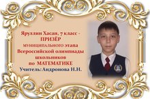 Поздравляем Хасана Яруллина и его учителя Наталью Николаевну Андронову с ПРИЗОВЫМ МЕСТОМ в муниципальном этапе Всероссийской олимпиады школьников по МАТЕМАТИКЕ среди учащихся 7 классов и желаем им новых ПОБЕД! Молодцы!!!