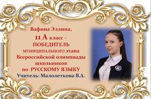 Поздравляем Элину Вафину и её учителя Веру Александровну Малолеткову с ПОБЕДОЙ в муниципальном этапе Всероссийской олимпиады школьников по РУССКОМУ ЯЗЫКУ среди учащихся 11 классов и желаем им новых ПОБЕД! Молодцы!!!