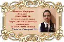 Поздравляем Маргариту Пьянову и её учителя Елену Ивановну Саттарову с ПОБЕДОЙ в муниципальном этапе Всероссийской олимпиады школьников по РУССКОМУ ЯЗЫКУ среди учащихся 8 классов и желаем им новых ПОБЕД! Молодцы!!!