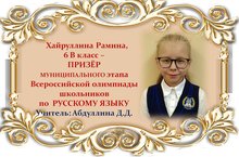 Поздравляем Рамину Хайруллину и её учителя Данию Дамировну Абдуллину с ПРИЗОВЫМ МЕСТОМ в муниципальном этапе Всероссийской олимпиады школьников по РУССКОМУ ЯЗЫКУ среди учащихся 6 классов и желаем им новых ПОБЕД! Молодцы!!!