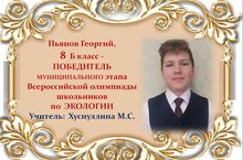 Поздравляем Георгия Пьянова и его учителя Марину Сергеевну Хуснуллину с ПОБЕДОЙ в муниципальном этапе Всероссийской олимпиады школьников по ЭКОЛОГИИ среди учащихся 8 классов и желаем им новых ПОБЕД! Молодцы!!!