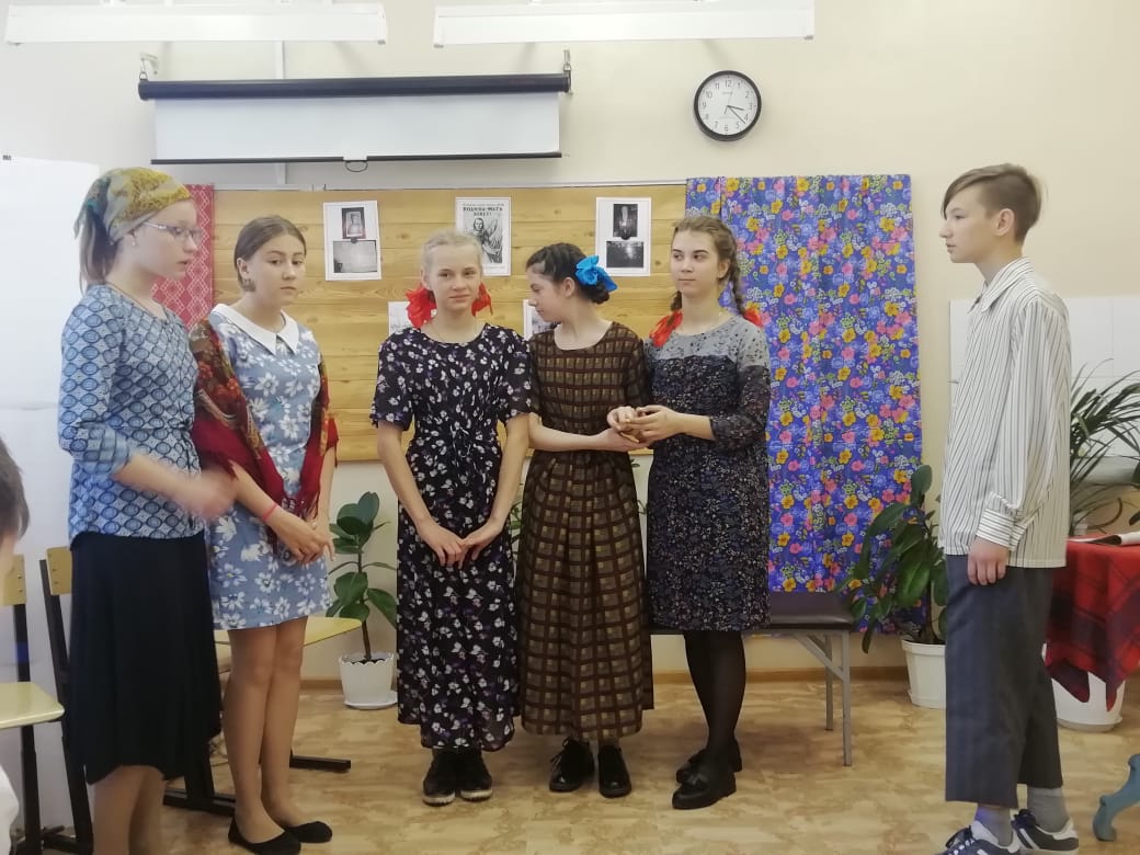 10 мая в 7Б класс были приглашены большие гости: труженица тыла - Корнева Вера Михайловна, дитя войны - Завьялова Лидия Ивановна, обе женщины - вдовы участников Великой Отечественной войны. На мероприятие были приглашены и родители нашего класса. Ребята приготовили и показали подарок: спектакль, посвящённый женщинам и детям войны "Просто ты умела ждать...". Когда закончился спектакль, Лидия Ивановна сказала: "Всё так и было..." Спектакль тронул всех присутствующих. Затем наши гостьи рассказали о себе, о трудной жизни в военные годы. Вера Михайловна работала на эвакуированном в Чистополь часовом заводе. Лидия Ивановна с мамой, с сестрой и братом переехали в 1941 году из Горьковской области в Чистополь , ближе к родине отца, который был в то время на фронте. Училась в школе. Семья жила очень тяжело. Женщины рассказали и о своих мужьях, ветеранах Великой Отечественной войны.