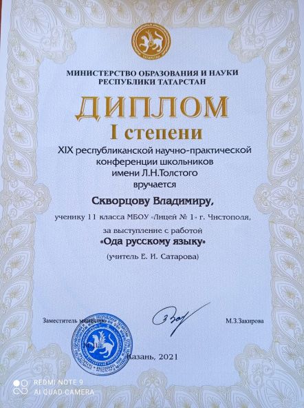 Опубликовано: 30.09.2021Поздравляем Скворцова Владимира , Саттарову Елену Ивановну, учителя русского языка и литературы с победой на XIX республиканской научно - практической конференции школьников имени Л.Н.Толстого . Желаем новых творческих побед !