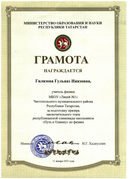 Опубликовано: 15.01.2022Поздравляем Лию Замалетдинову, ученицу 11 класса, и её учителя Гульназ Ниязовну Гилязову с ПРИЗОВЫМ МЕСТОМ в заключительном этапе республиканской олимпиады школьников по ФИЗИКЕ «Путь к Олимпу»! Молодцы! Новых вам побед!!!