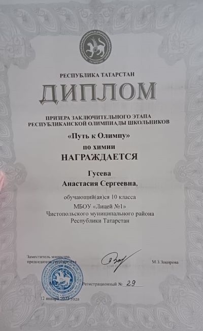 Опубликовано: 13.01.202311- 13 января проходила республиканская олимпиада по химии " Путь к Олимпу". Учащиеся лицея Рогова Настя 9 а класс, Потемкин Артур 8 а класс, Гусева Настя 10 а класс, приняли участие в Олимпиаде. Призером олимпиады стала Гусева Настя. Поздравляем Настю с хорошим результатом.